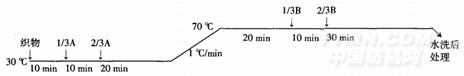 工藝配方:活性染料2.O%(ow0,NaCI(A)60g/L,無水Na2CO3(B)2Og/L,浴比1:50.