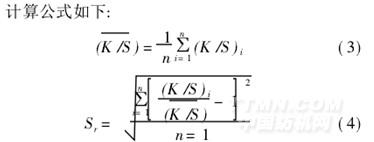 試樣采用1% (omf)染料染色, 130℃染色30min,然后測(cè)定試樣上任意8個(gè)點(diǎn)的K/S值,按式(3)計(jì)算8個(gè)點(diǎn)的K/S平均值,并按式(4)計(jì)算各點(diǎn)K/S值對(duì)平均值的相對(duì)偏差Sr(x),用以表示織物染色后顏色的相對(duì)不勻性。