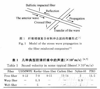 研究發(fā)現(xiàn),應(yīng)力波在兩種不同的材料中傳播時(shí),當(dāng)傳至兩種材料的界面會(huì)產(chǎn)生入射波和反射波口],而且應(yīng)力波在產(chǎn)生塑性變形的材料中的傳遞較在彈性變形材料中的傳遞規(guī)則許多。應(yīng)力波在纖維中傳播速度主要取決于纖維的楊氏模量I5及其在復(fù)合材料中的狀態(tài)。一般,材料的模量越高,質(zhì)量越低,應(yīng)力波傳播的速度越快。關(guān)于纖維形態(tài)對(duì)應(yīng)力波傳播速度的影響,陳利民_6通過對(duì)Kevlar一29和尼龍66織物研究,認(rèn)為織物中的纖維若存在交迭點(diǎn)或縐縮會(huì)使應(yīng)力波產(chǎn)生反射,影響應(yīng)力波在其中傳播(如圖1)。表1為應(yīng)力波在幾種自由纖維(皺縮率為0的纖維)和織物中的傳播速度,從表中可以看出,纖維模量越高,應(yīng)力波的傳播速度就越快,自由纖維傳播應(yīng)力波的能力明顯高于經(jīng)向纖維和緯向纖維。因此,在防彈復(fù)合材料的設(shè)計(jì)中,需兼顧纖維的力學(xué)性能及纖維在織物中的狀態(tài)。