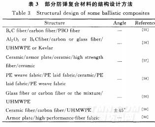 防彈材料自問世以來就以迅猛的速度向前發(fā)展,由早期的普通金屬防彈板到單層的纖維增強樹脂基體的防彈復合材料,再發(fā)展到當今多層次、梯度化結(jié)構(gòu)復合材料。表3為部分國內(nèi)外關(guān)于防彈復合材料的結(jié)構(gòu)設計。