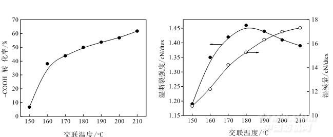 圖 4 交聯(lián)溫度對(duì)-COOH 轉(zhuǎn)化率的影響 圖 5 交聯(lián)溫度對(duì)粘膠纖維濕斷裂強(qiáng)度和濕模量的影響