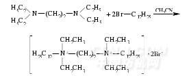 盧婷[9]等用BrC12H25和N,N,N',N'-四乙基-1,2-乙二胺等合成了一種具短聯(lián)結(jié)基團(tuán)的陽(yáng)離子型Gemini表面活性劑二亞甲基-1,2-二(十二烷基二乙基溴化銨),簡(jiǎn)寫作C12C2C12(Et).將16.42gBrC12H25置于圓底燒瓶中,再加入25mL乙腈,加熱至沸,并將溶于乙腈(12mL)的N,N,N',N'-四乙基-1,2-乙二胺(5.15g)滴入燒瓶中,加熱回流并補(bǔ)加乙腈,使溶劑量基本保持不變.回流48h后除去溶劑得到棕色固體.用乙醇-乙酸乙酯重結(jié)晶6次即得較純的產(chǎn)物,化學(xué)方程式為: