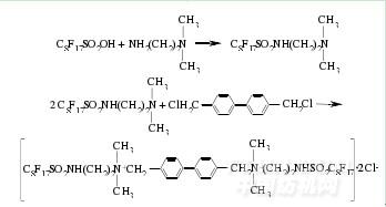 另外,王利民[26]等還合成了一種含氟聯(lián)苯鏈聯(lián)結(jié)基陽離子型Gemini表面活性劑.反應(yīng)中將100mL甲苯、0.01mol全氟辛磺酸和0.02mol胺加入到三口燒瓶中,然后在110~120℃回流反應(yīng)12h,提純后即為中間產(chǎn)物全氟磺酰胺.然后向0.01mol全氟磺酰胺和50mL乙醚混合物中加入0.02mol4,4'-二氯甲基聯(lián)苯,回流反應(yīng)48h,提純后即得到含氟聯(lián)苯鏈聯(lián)結(jié)基陽離子型Gemini表面活性劑,反應(yīng)式為: