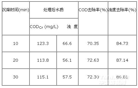 分別量取三份200mL水樣于干凈燒杯中,調節(jié)溶液pH值到8,再加入0.1g PAC絮凝劑,以150r/min的攪拌速度作用10min。第一個燒杯靜置10min后,取上層清液,測CODCr、濁度等指標;第二個靜置20min后,測各項指標;第三個靜置30min后,測各項指標。以此考察沉降時間對CODCr、濁度去除率的影響。結果如表6所示。