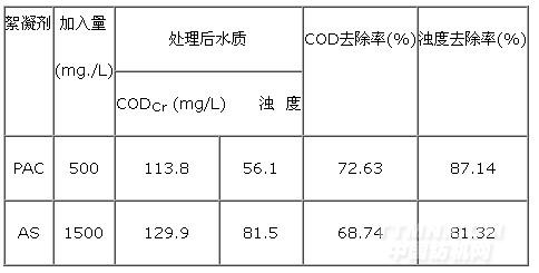 按照PAC實驗的步驟,進行同樣的實驗。我們得出AS的最佳加入量為1500 mg/L,最佳絮凝pH值為8。在此最佳絮凝效果的情況下,AS對印染廢水的處理效果達到:CODCr去除率達68.74%,濁度去除率達81.32%。與PAC絮凝效果進行對比,得表7。