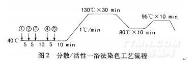 滌棉織物一浴法染色有兩種方法,即一浴一步法和一浴兩步法。與一浴兩步法相比,一浴一步法流程更為簡(jiǎn)單、時(shí)間短、耗能省,但對(duì)染料的要求比較高,在染料選擇和工藝設(shè)計(jì)中有一定的難度。一浴一步法染色又可分為酸性、中性、堿性和pH值滑移法等4種方法。本試驗(yàn)選用中性條件,用緩沖劑調(diào)節(jié)pH值為7,所用染色織物為滌棉(85/15),浴比1:l0,染色工藝流程見(jiàn)圖2。