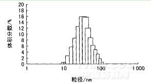 由圖3知,所得乳液粒徑細小,分布均勻,乳液粒徑大小主要集中在20~70nm,平均粒徑為42.0nm。