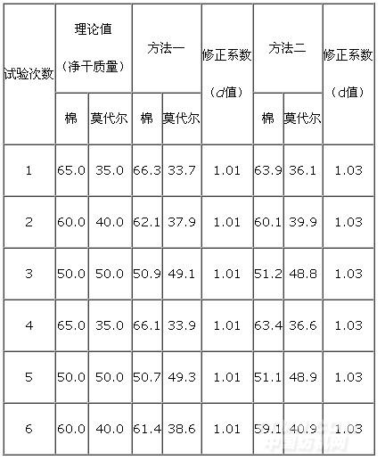 莫代爾纖維在方法一、方法二溶液中全部溶解,棉在方法一溶液中的損傷小,測試結(jié)果更接近實(shí)際混紡比,建議在檢測試驗(yàn)中采用方法一。經(jīng)計(jì)算,修正系數(shù)d值取1.01,棉在方法二溶液中的修正系數(shù)d值取1.03。