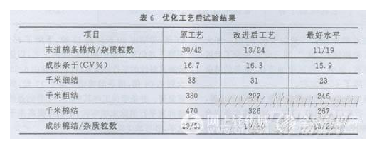 并條采取了上述三項工藝措施之后,棉條的棉結(jié)雜質(zhì)粒數(shù)下降了將近50%,成紗的千米棉結(jié)粒數(shù)下降了100粒。測試結(jié)果見表6。