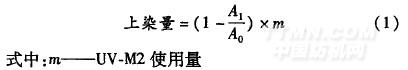 使用紫外一可見光分光光度儀,采用殘液法測試UV.M2上染量,即分別測試染色前原液吸光度A。和染色后殘液吸光度A。,按式(1)計算上染量(m):