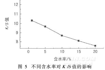 滌綸長(zhǎng)絲在紡絲過(guò)程中會(huì)加入一定的油劑,所以染色前要經(jīng)過(guò)去油處理。織帶染色前處理后一般進(jìn)行烘干,而烘筒表面溫度的不均勻會(huì)造成坯帶含水率差異,嚴(yán)重時(shí)會(huì)造成織帶左中右色差。圖5為坯帶含水率對(duì)坯帶K/S值的影響。