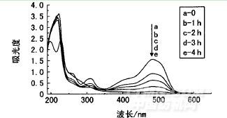 用制備的催化材料降解初始濃度為30mg/L的酸性橙Ⅱ,采用UV-VIS光譜儀對光催化降解酸性橙Ⅱ之后的溶液進行190~600nm波長掃描。圖8為不同光照時間后酸性橙Ⅱ的波長掃描圖。