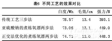 從上表6可以看出,采用正交法優(yōu)化的煮練氯漂兩步法處理的織物,白度要比傳統(tǒng)工藝差,毛效相差不多,但其強力高于傳統(tǒng)的工藝。說明此法具有一定的先進性,對于省去不利于環(huán)保的氯漂具有一定的意義。與只使用亞硫酸鈉作煮練助劑相比,煮練過程中同時添加硫化鈉和蒽醌會有助于改善織物的白度和毛效,且對織物的強力影響不大。