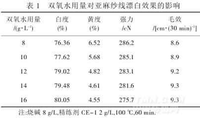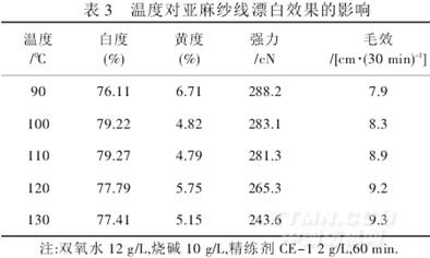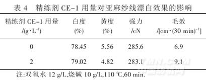 精練劑CE-1 具有促進(jìn)工作液迅速徹底地在纖維內(nèi)部發(fā)生反應(yīng),賦予纖維極高毛效的作用.由于亞麻紗線含雜相對較少,確定精練劑CE-1 用量為2 g/L進(jìn)行試驗.由表4 可看出,精練劑CE-1 的添加與否對白度以及強(qiáng)力幾乎沒有影響;而對于毛效,未加精練劑CE-1 時,雙氧水在漂白的同時也具有一定的除雜能力,但遠(yuǎn)低于添加精練劑CE-1 的.毛效對后續(xù)染色過程尤其是染料的擴(kuò)散性、勻染性影響很大.因此,一般在亞麻紗線漂白過程中加入一定量精練劑CE-1,以除去纖維或織物上原始雜質(zhì)和前道加工帶入的雜質(zhì),提高毛效,滿足后續(xù)染整加工的要求.