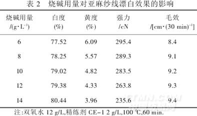 從表2 可知,白度隨著燒堿用量的增加而增加,黃度則逐漸下降;強(qiáng)力隨著燒堿用量的增加而下降,燒堿用量過大時,下降極為嚴(yán)重;毛效隨燒堿用量增加而提高,≥8 g/L 時,毛效增加趨緩,均在9.0 cm/30 min 以上.綜合考慮,燒堿以10 g/L 為宜.