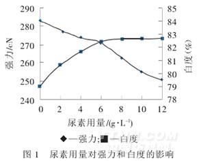 尿素與過(guò)氧化氫相互作用形成了一個(gè)復(fù)合物,以促進(jìn)過(guò)氧化氫較快分解且形成有效分解.[5]從圖1 可知,隨著尿素用量的增大,白度逐漸增加,強(qiáng)力逐漸減小;6 g/L 時(shí),白度較高,強(qiáng)力下降幅度較小;當(dāng)>6 g/L 后,由于尿素的活化作用大,使雙氧水的分解過(guò)快,不能有效地漂白纖維,對(duì)纖維損傷較為嚴(yán)重,白度增加也不明顯,故尿素用量確定為6 g/L.