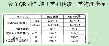 (2)QR冷軋堆工藝加工的織物白度和強(qiáng)力都高于傳統(tǒng)工藝,手感柔軟滑爽,半制品無堿斑,無風(fēng)干印等疵病。布面棉籽殼去除較凈,各項(xiàng)指標(biāo)可滿足染色或印花工序?qū)Π胫破返墓に囈蟆?/p>
