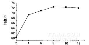 雙氧水漂白時(shí),為了控制雙氧水的分解和防止產(chǎn)生破洞,通常在漂液中加人穩(wěn)定劑,以有效地螯合Cu2+、Fe3+、Mn2+和Ni2+等金屬離子。圖8為穩(wěn)定劑用量對織物白度的影響。