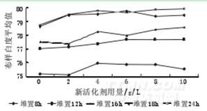 由圖2-3中曲線可以看出,堆置時(shí)間不同以及新活化劑用量不同對(duì)織物的漂白效果都有較大的影響。