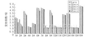 按1.2節(jié)試驗(yàn)步驟,將試樣在20mg/L的氯化水溶液中浸泡不同時(shí)間(5、10、20、30、45min),研究浸泡時(shí)間對紡織品耐光/氯化水復(fù)合色牢度的影響,結(jié)果見圖2。