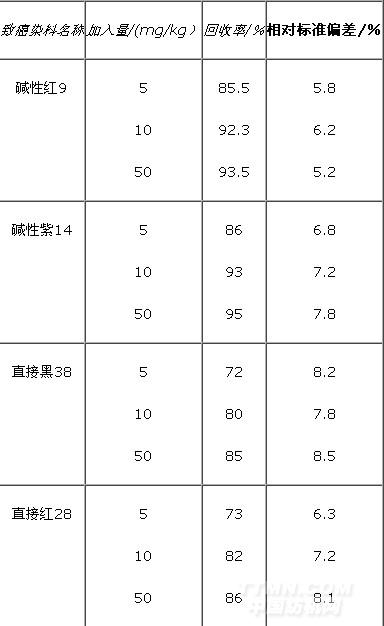 在不含致癌染料的標(biāo)準(zhǔn)樣品中, 以標(biāo)準(zhǔn)加入法進(jìn)行回收率試驗(yàn),添加濃度分別為5 mg/L,10 mg/L,50 mg/L,將 9種染料分別加入1.0 g對(duì)應(yīng)的適染纖維織物樣品上,重復(fù)測(cè)量6次進(jìn)行實(shí)驗(yàn),實(shí)驗(yàn)測(cè)的在低、中、高的3個(gè)添加水平范圍內(nèi)的平均回收率為72%~95%,計(jì)算每個(gè)樣品的相對(duì)標(biāo)準(zhǔn)偏差,結(jié)果均小于10%,結(jié)果見表3: