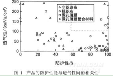 圖1為薄膜和復(fù)合薄膜與非織造布、機(jī)織布防護(hù)材料間的性能對(duì)比。