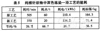 表5表明,對(duì)于純棉針織物中深色的漂底染色一浴工藝,生化技術(shù)較傳統(tǒng)技術(shù)有很好的節(jié)水、電、汽(標(biāo)煤)的優(yōu)勢(shì)。