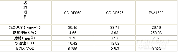 2.2  CD-DF858是經(jīng)過醚化、酯化預(yù)處理后,再進(jìn)行接枝共聚的多元復(fù)合變性淀粉為主,通過先進(jìn)工藝加入特殊高聚物制成。其粘度低,流動(dòng)性好,對(duì)紗線的浸透性能好,不含PVA,適用于純棉、滌棉高支高密的經(jīng)紗上漿,可完全取代PVA,其BOD5/COD=0.286基本達(dá)到環(huán)保要求。