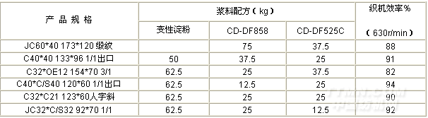 5.1 用CD-DF858和CD-DF525按一定比例搭配,完全取代PVA是可行的。在織機(jī)效率穩(wěn)定提高的同時(shí),降低上漿成本18%左右,每月節(jié)約漿料成本5-6萬元,并且符合環(huán)保要求。