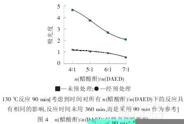 以P2O5與濃H2SO4制備三氧化硫并作為預處理劑對醋酸酐進行預處理.反應溫度和反應時間對黑色副產(chǎn)物的產(chǎn)生影響較大,n(醋酸酐)∶n(DAED)的影響很小.經(jīng)預處理的醋酸酐與DAED反應,當反應時間超過360min后,黑色副產(chǎn)物的濃度不到相同條件下未預處理時的1/5,顯示出醋酸酐預處理對黑色副產(chǎn)物的產(chǎn)生具有良好的抑制作用.