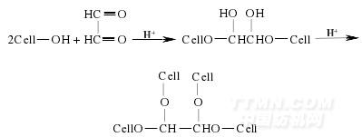 乙二醛是一種簡(jiǎn)便易得的非甲醛類整理劑,在硫酸鋁催化作用下,用乙二醛溶液經(jīng)浸軋→烘干→焙烘工藝處理棉織物或真絲織物,可使織物獲得防皺防縮效果.乙二醛分子中2 個(gè)醛基先與棉纖維分子的羥基反應(yīng)生成半縮醛,再進(jìn)一步反應(yīng)生成縮醛,最終結(jié)果通過(guò)亞甲基醚鍵將纖維分子連接在一起,反應(yīng)式如下[29]: