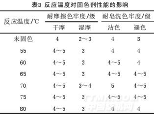 在20~25℃的條件下。當(dāng)二乙烯三胺滴完后升溫至一定的溫度反應(yīng)5h。研究反應(yīng)溫度對(duì)固色劑性能的影響,其結(jié)果如表3所示。