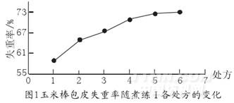 由圖1結(jié)合表4實驗結(jié)果可知,隨著氫氧化鈉等在各處方的改變,玉米棒包皮的失重率也隨著增加,在處方1和3之間,失重率增幅較大;在處方3和5之間,失重率增幅較?。辉谔幏?和6之間,失重率幾乎沒有發(fā)生變化。為了使纖維的損傷較小和降低處理成本,綜合選擇處方2為煮練Ⅰ的工藝處方。