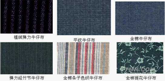 牛仔布是以純棉靛藍(lán)染色的經(jīng)紗與本色的緯紗,采用三上一下的右斜紋組織交織而成,一般可分為輕型,中型,和重型三類。布的寬度大多在114- 152公分之間。