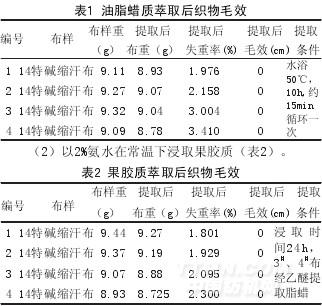 (1)將堿縮后的棉針織汗布,通過索氏抽取器以乙醚萃取其油脂蠟質,結果見表1。