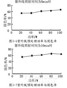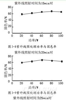 由圖3-6到圖3-11可見,不同的紫外線功率預(yù)處理時間對上染率提高的規(guī)律不同,也有一個明顯的峰值。隨著處理功率的增大,上染率有下降趨勢時間越長這種趨勢越明顯。原因功率過高,輻射能中高能活性粒子數(shù)量增多和能量增大,纖維素被氧化的程度越激烈,降低對染料的吸附能力[4-5],導(dǎo)致上染率達(dá)到峰值后開始回落。