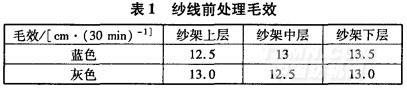 由表1可知,苧棉紗線前處理半成品的毛效為l0一15cm/30min,而同紗支純棉紗線前處理半成品的毛效也在l0~15cm/30rain范圍內(nèi),符合染色要求。