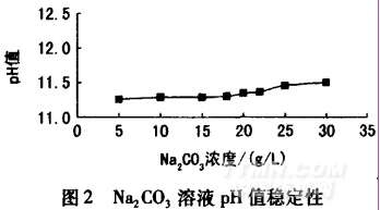 根據(jù)純堿在實(shí)際生產(chǎn)中的理論用量,選取5—30g/L用量測(cè)試其pH值,結(jié)果見圖2。