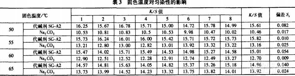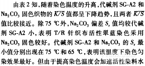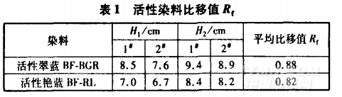 從表1可知,兩只染料的比移值甩都小于0.9,表明染料直接性小【2】。這兩只染料的分子結(jié)構(gòu)均較大.吸附與擴(kuò)散速率較慢,移染性差,染色平衡時(shí)間相對較長,容易染花?;钚源渌{(lán)一般為酞菁染料,其母體分子較大,所以溶解度較低口J。由于鹽析效應(yīng),活性翠藍(lán)溶解性會(huì)進(jìn)一步降低,造成染料凝聚,形成表面染色,對勻染不利。因此,要解決T/R針織布翠藍(lán)色花,要從提高染料的反應(yīng)性、擴(kuò)散性,以及降低固色速率和減少固色色花等方面著手。