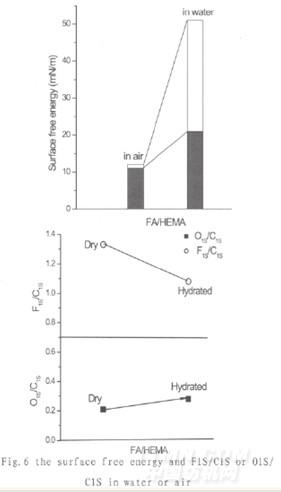 共聚物在空氣和水中的表面狀態(tài),通過(guò)freeze-etchXPS[6]來(lái)計(jì)算最高面積比F1S/C1S和O1S/C1S。F1S/C1S是FA全氟烷基與AA側(cè)鏈烷基在表面所占的面積比,O1S/C1S是親水基團(tuán)與AA側(cè)鏈烷基在表面所占的面積比。由圖5可知,隨著AA側(cè)鏈烷基碳原子數(shù)變小F1S/C1S的值也會(huì)變小,這是因?yàn)?碳以下不發(fā)生結(jié)晶,遇水后全氟烷基自發(fā)性地向涂膜內(nèi)部后退,水接觸織物表面產(chǎn)生潤(rùn)濕。針對(duì)以上情況,為了賦予FA/AA共聚物較高的防水性需要約束分子鏈的運(yùn)動(dòng),即使是在與水接觸也要保持與空氣中一樣的表面狀態(tài)。當(dāng)AA側(cè)鏈烷基碳原子數(shù)增加至12以上開(kāi)始結(jié)晶,當(dāng)AA側(cè)鏈烷基碳原子數(shù)增加至18以上則結(jié)晶度高,F(xiàn)1S/C1S的最高面積比顯著增大,防污性能提高。