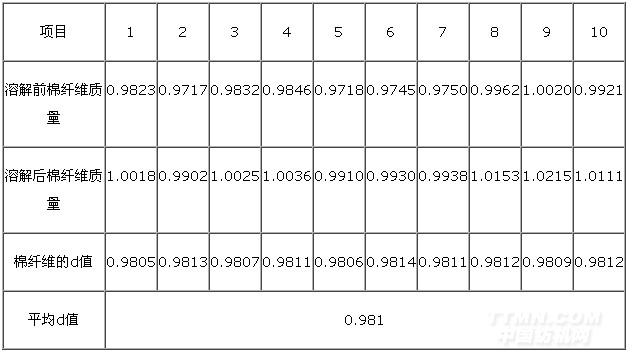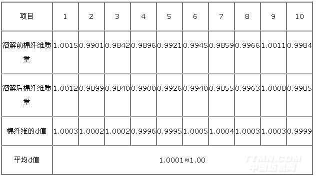 5#粘膠與棉混合物中,兩種纖維均為散纖維,不加任何捻度,也不受紡紗、染色或后整理過程中造成的損傷,測(cè)試結(jié)果粘膠需要溶解20 min,棉纖維的修正系數(shù)d=1.00. 測(cè)定數(shù)據(jù)見表4。