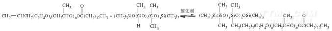 在配有攪拌器、球形冷凝管、氮?dú)鈱?dǎo)氣管的干燥三口燒瓶中加入自制低含氫硅油、聚醚酯、溶劑甲苯和0.002%(對(duì)反應(yīng)物質(zhì)量)氯鉑酸(催化劑).通入氮?dú)?攪拌,升溫至合適溫度,反應(yīng)一定時(shí)間,得無色透明粘性液體.55 ℃下進(jìn)行減壓蒸餾,蒸出溶劑甲苯.反應(yīng)式如下: