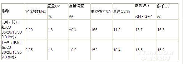該系列紗線產(chǎn)品質(zhì)量除纖維含量未檢測外,其余技術(shù)指標(biāo)均達(dá)到GB/T 398—1993《棉本色紗線》國家標(biāo)準(zhǔn)一等品以上要求。