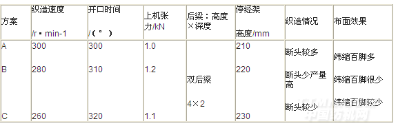(1)方案A中針對(duì)多種緯紗緯入、構(gòu)成較為復(fù)雜、換緯較頻繁、張力不易控制送緯難等情況,將開口時(shí)間提早,以避免緯紗交接脫緯。但由于開口時(shí)間過早,車速偏快,經(jīng)紗斷頭多,易出現(xiàn)配合不良斷頭等問題。