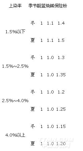 靛藍染料的色牢度本身是比較低的,如果我們掌握不好靛藍染料的生產(chǎn)工藝,那就會造成染料的大量掉色,色光發(fā)暗、發(fā)紅、不發(fā)青、沒有光澤等問題。靛藍染料還原時,適當(dāng)?shù)臒龎A和保險粉用量以及還原時間是問題的關(guān)鍵。如果還原時間比較長,化好的染料要3~4小時以后才用,可以適當(dāng)?shù)奶岣邿龎A、保險粉的用量,反之則要降低。生產(chǎn)環(huán)境溫度在25度以下,可適當(dāng)降低保險粉的用量;生產(chǎn)環(huán)境溫度在25度以上,可適當(dāng)提高保險粉的用量。經(jīng)驗認(rèn)為,在廣東地區(qū)靛藍、燒堿、保險粉的用量比例調(diào)整為以下數(shù)據(jù)較好。