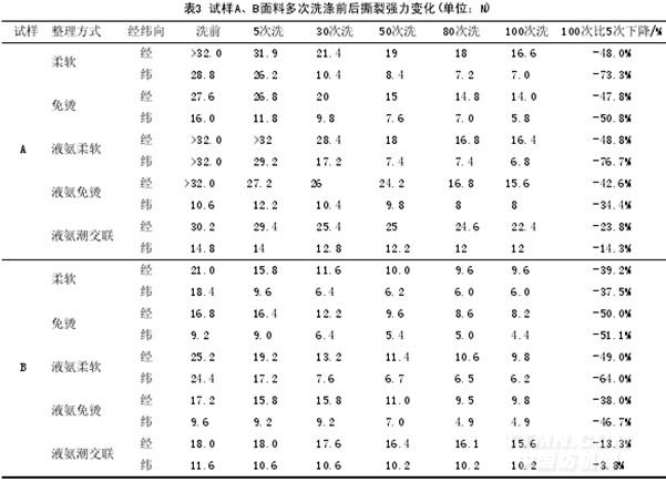 由表3明顯看出,隨著洗滌次數(shù)的增加,撕破強(qiáng)力明顯呈下降的趨勢(shì),平均下降40%左右,但潮交聯(lián)整理強(qiáng)力下降平均只有15%左右,這是因?yàn)樵诔睉B(tài)工藝下,水更容易拆散纖維內(nèi)部的一些薄弱環(huán)節(jié),在此狀態(tài)下發(fā)生的分子間交聯(lián)更加均勻,因此其強(qiáng)力受洗滌影響較少。