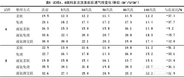 斷裂強(qiáng)力相對(duì)撕破強(qiáng)力來說洗滌后下降較少。由表4看出,兩面料洗滌100次后平均比5次只下降5%左右。柔軟和液氨柔軟的下降的多,約10%左右,而免燙(包括潮交聯(lián))品種基本無變化,主要原因免燙整理分子間發(fā)生交聯(lián),纖維相對(duì)柔軟品種緊密。