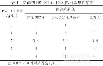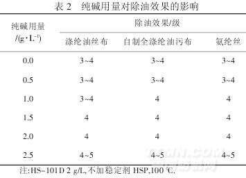 從表1 看出,隨著除油劑HS-101D 用量的增加,除油效果增強(qiáng),3 g/L 時(shí),除油效果較空白提高了3 級(jí),說(shuō)明除油劑HS-101D 本身對(duì)織物油漬乳化及分散作用好,無(wú)需借助堿劑對(duì)油漬分解即可發(fā)揮除油作用,繼續(xù)增加用量,除油效果增加不明顯.