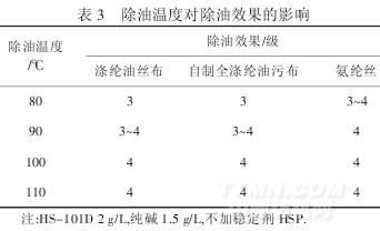從表3 看出,80 ℃時(shí),除油效果達(dá)到3 或3~4 級(jí);90 ℃時(shí),可達(dá)3~4 或4 級(jí);100 ℃時(shí),可達(dá)4 級(jí).原因是隨溫度升高,除油劑對(duì)油漬的溶解度增大、乳化程度增強(qiáng),使溫度對(duì)除油效果有增強(qiáng)作用.綜合考慮,選擇滌綸除油溫度為100 ℃,氨綸絲為90 ℃.
