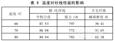 分別于60、70、80℃的溫度下對棉/毛紗線和羊毛纖維漂白,測試漂后紗線的白度、強力和羊毛的堿溶解度,結果如表5所示。